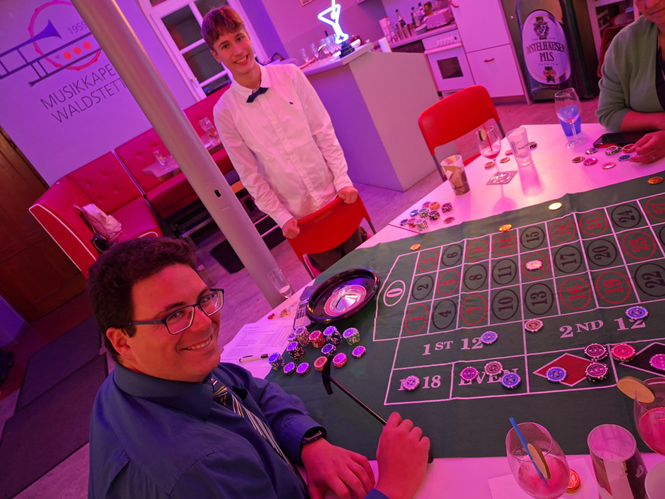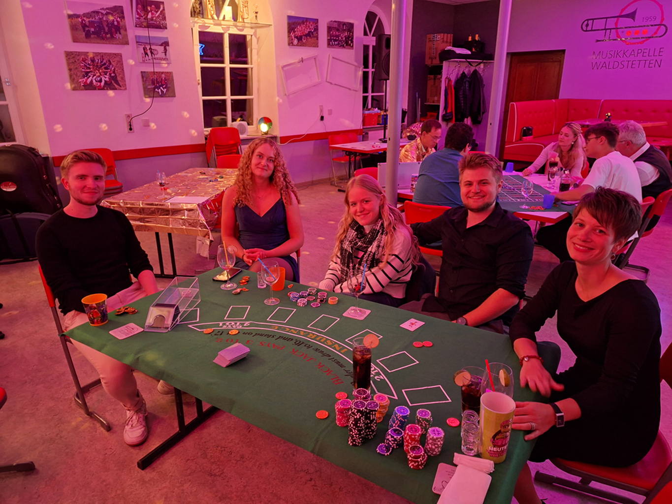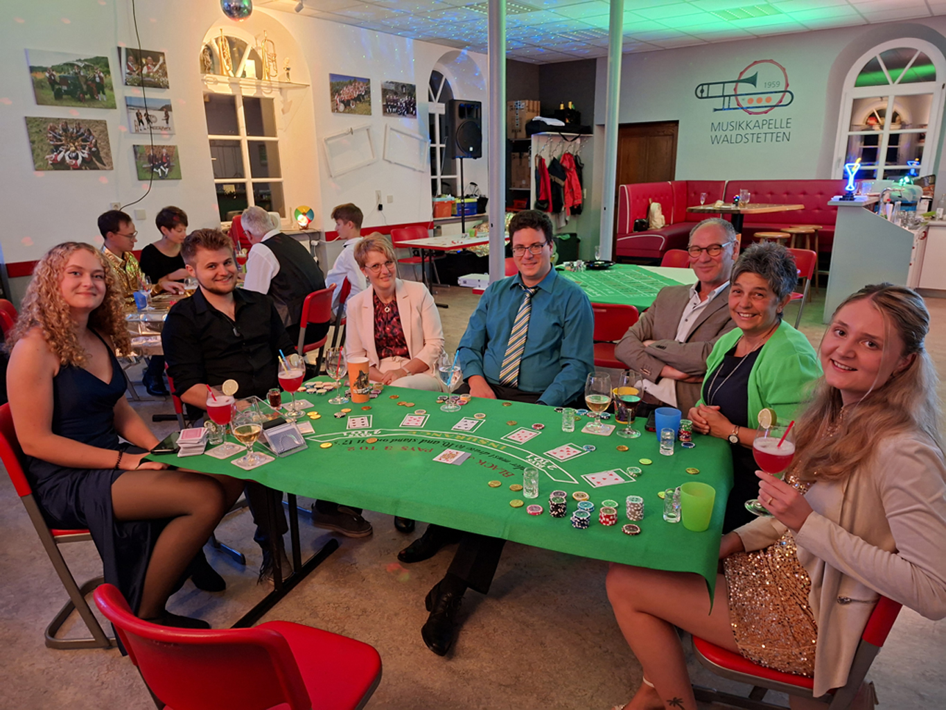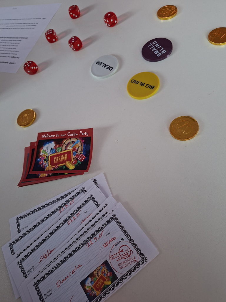 Am 27. September verwandelte sich der Proberaum der Musikkapelle Waldstetten kurzerhand in ein hochkarätiges Casino – inklusive glamourösem Empfang mit Sektglas in der Hand und persönlicher Eintrittskarte für das Casino. Diese konnte dann gegen eine Auswahl an Casino-Chips eingetauscht werden, mit denen die Spiele bestritten wurden. Jackpot gleich am Anfang.